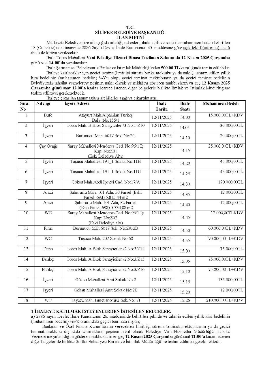 MÜLKİYETİ BELEDİYEMİZE AİT 18 (ON SEKİZ) ADET TAŞINMAZIN 2886 SAYILI DEVLET İHALE KANUNUNUN 45. MADDESİNE GÖRE AÇIK TEKLİF (ARTTIRMA) USULÜ İHALE İLE KİRALAMA İLANIDIR.